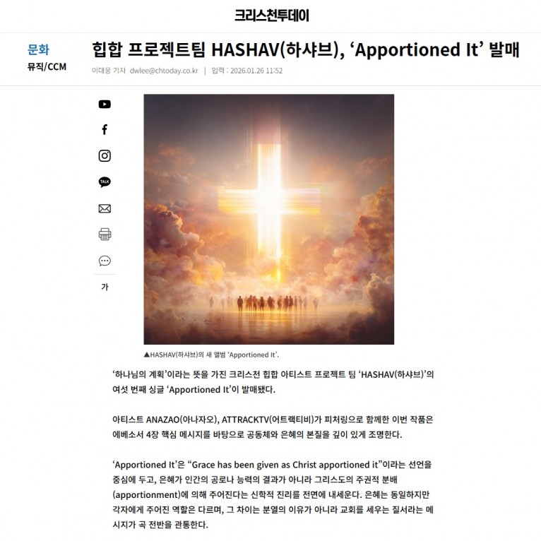 [기사] 힙합 프로젝트팀 HASHAV(하샤브), ‘Apportioned It’ 발매(크리스천투데이)