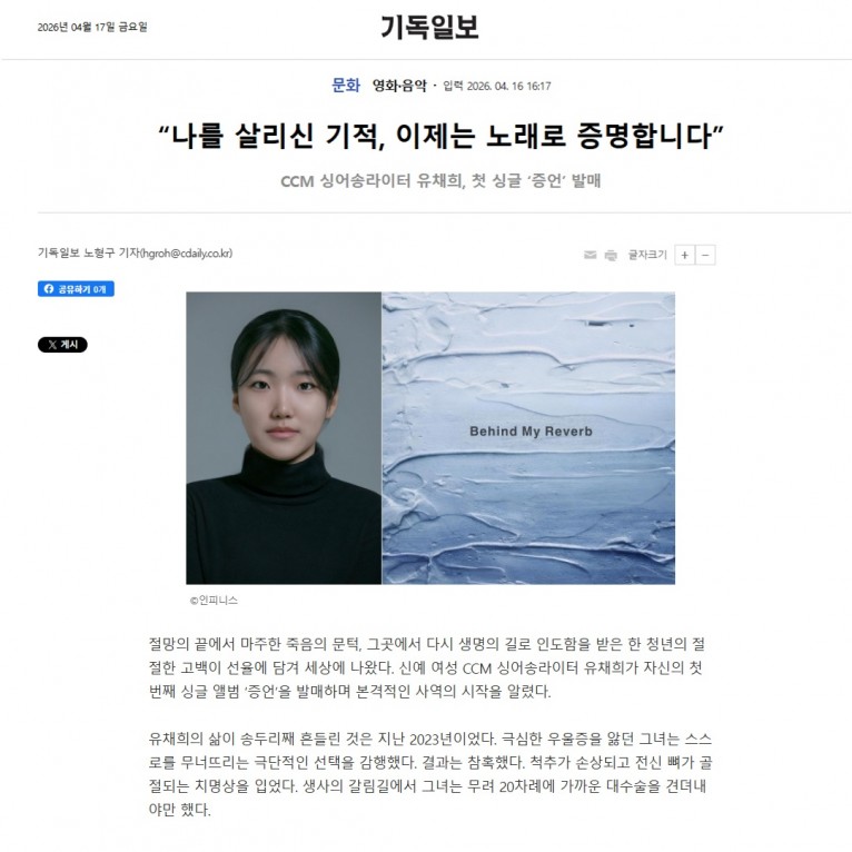[기사] “나를 살리신 기적, 이제는 노래로 증명합니다” CCM 싱어송라이터 유채희, 첫 싱글 ‘증언’ 발매(기독일보)